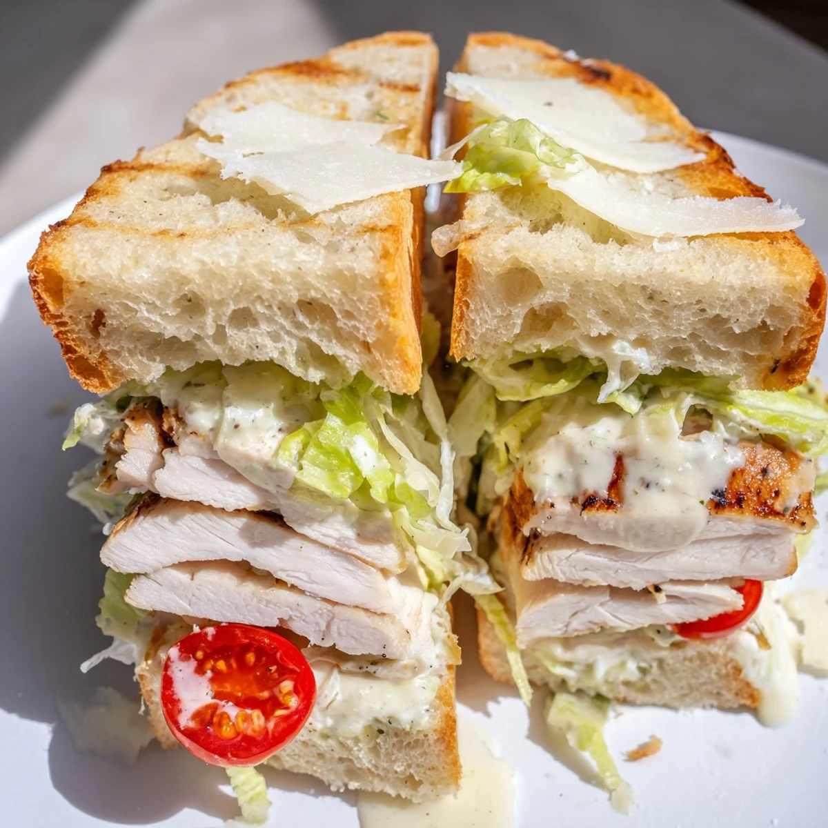 - Spread dressing on each roll, layer with romaine, sliced chicken, shaved Parmesan, and cherry tomatoes, then close them up and slice in half before serving