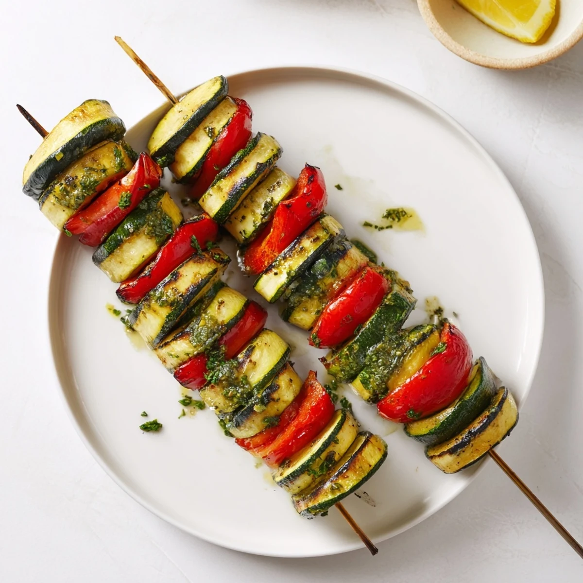 Sliced zucchinis and bell pepper are threaded onto skewers, brushed with a garlic butter spiked with parsley, then seared over medium-high heat until tender with light char marks. Soak wooden skewers beforehand to prevent burning and baste often for extra gloss and flavor.