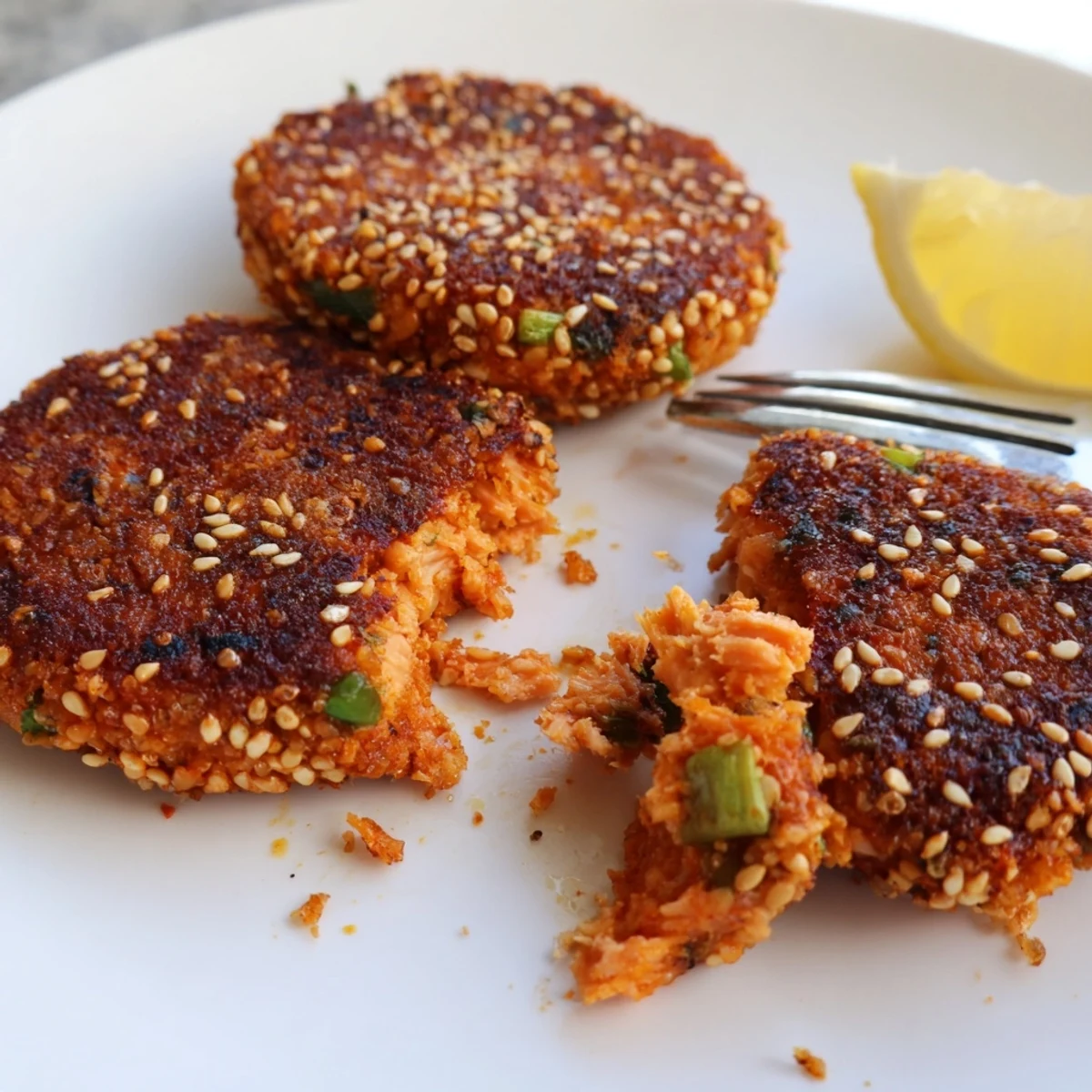 These golden salmon patties combine fresh fish with the bold flavors of North African cuisine. Harissa paste brings a gentle heat while toasted sesame seeds add a satisfying crunch. The mixture comes together quickly in a food processor, then shapes easily into eight portions.