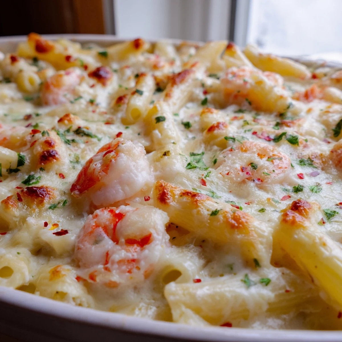 This comforting Italian-American bake combines al dente penne with plump shrimp swimming in a velvety lemon-garlic cream sauce. The dish comes together with a luxurious blend of butter, olive oil, white wine, and heavy cream, brightened with fresh lemon zest and juice. After a quick stovetop preparation, everything gets topped with mozzarella and parmesan before heading into the oven for 15-18 minutes until golden and irresistibly bubbly. The result layers tender seafood with perfectly coated pasta and a crisp, cheesy crust that offers satisfying crunch in every bite.
