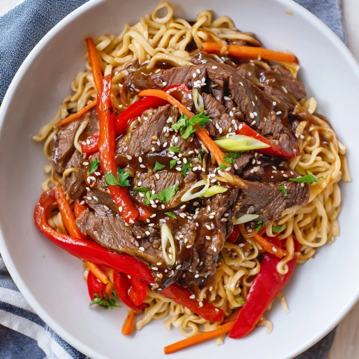 Marinate thinly sliced beef briefly with soy, cornstarch and sesame oil, then sear over high heat so it stays tender. Stir-fry garlic, grated ginger and crisp veg until just softened, add a hoisin-dark soy-oyster sauce sweetened with honey, then toss in cooked egg noodles. Combine beef and noodles in the wok until glossy and well coated; finish with toasted sesame and fresh herbs for a quick, comforting weeknight dish. Swap proteins or noodles to suit dietary needs and reheat gently.